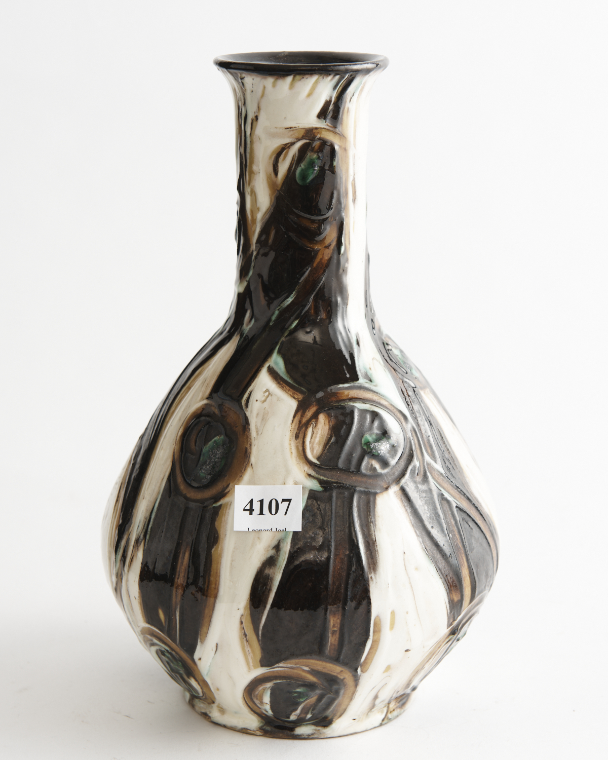 AN EARLY 20TH CENTURY DANISH EARTHENWARE VASE ATTRIBUTED TO THORVALD BINDESBOLL FOR HERMAN KAHLER WITH INCISED INITIALS AND KAHLER STICKER (30 CM H), LEONARD JOEL LOCAL DELIVERY SIZE: SMALL