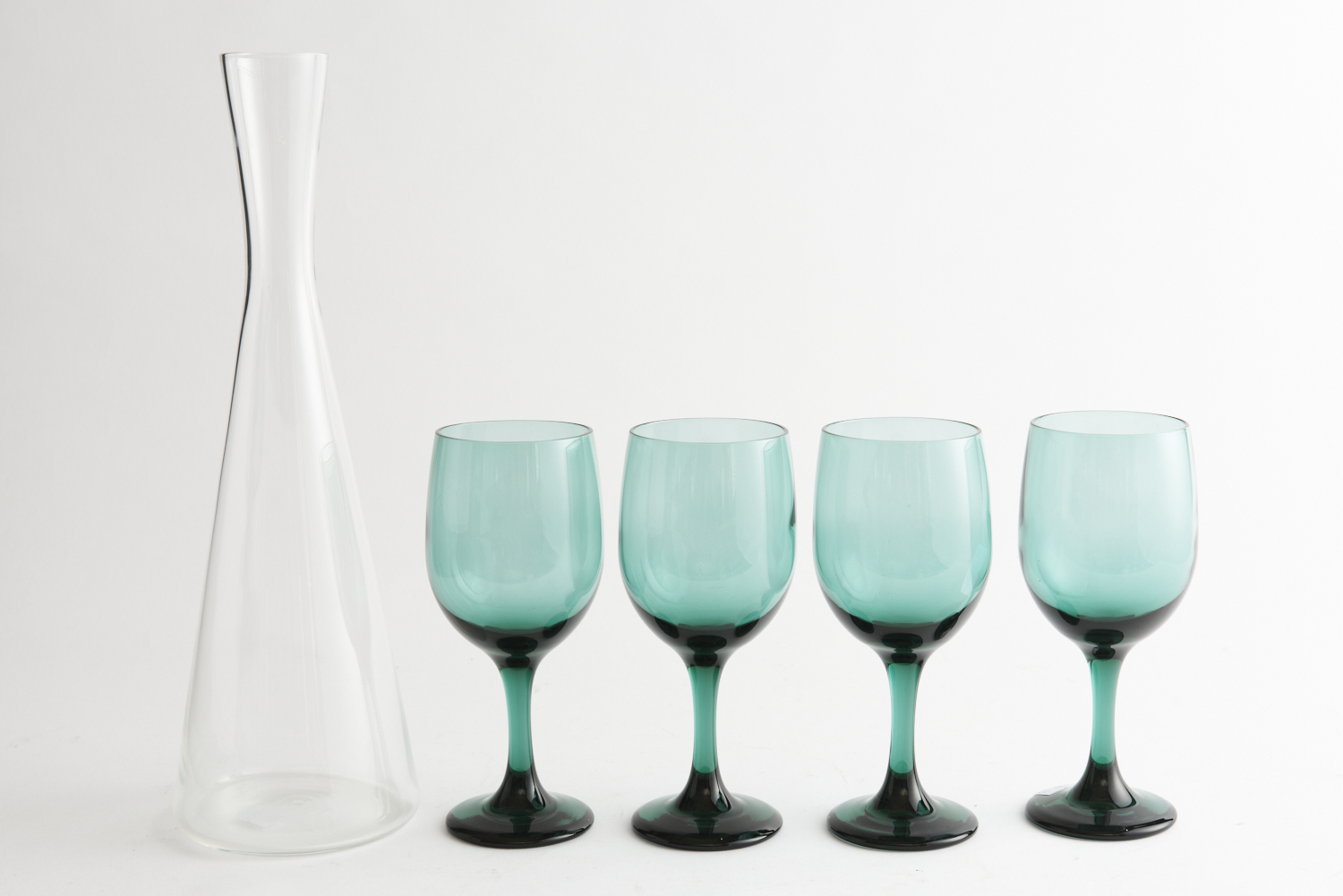 A HOLMEGAARD WINSTON WINE DECANTER BY PER LUTKIN AND FOUR LIBBEY PREMIERE EMERALD GREEN WINE GLASSES (35 CM H), LEONARD JOEL LOCAL DELIVERY SIZE: SMALL