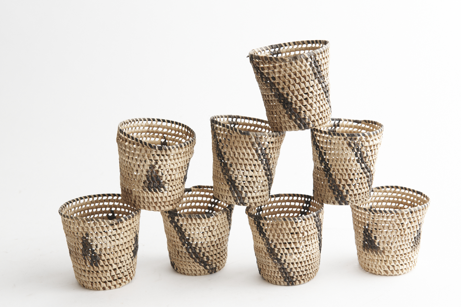 EIGHT ITALIAN SPLIT CANE AND WOVEN RAFFIA ESPRESSO GLASS HOLDERS, LEONARD JOEL LOCAL DELIVERY SIZE: SMALL