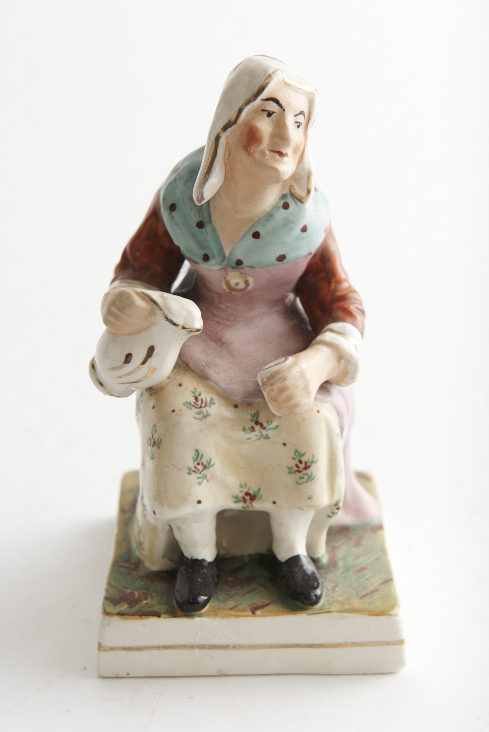 A 19TH CENTURY STAFFORDSHIRE FIGURE OF A LADY POURING A DRINK H.16CM, LEONARD JOEL LOCAL DELIVERY SIZE: SMALL