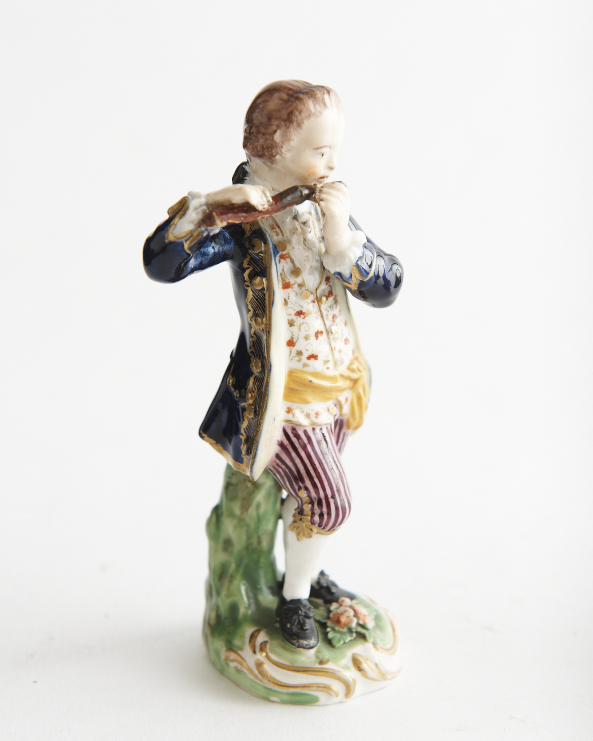 A DERBY FIGURE OF A BOY PLAYING THE FLUTE, CIRCA 1900, H.11.5CM, LEONARD JOEL LOCAL DELIVERY SIZE: SMALL