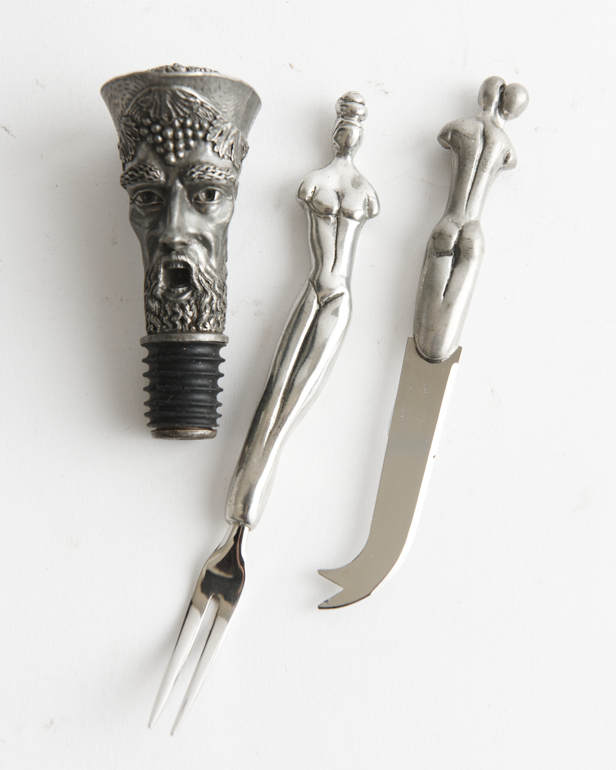 FIGURAL METAL ART CHEESE KNIFE, FORK AND BOTTLE STOPPER, LEONARD JOEL LOCAL DELIVERY SIZE: SMALL