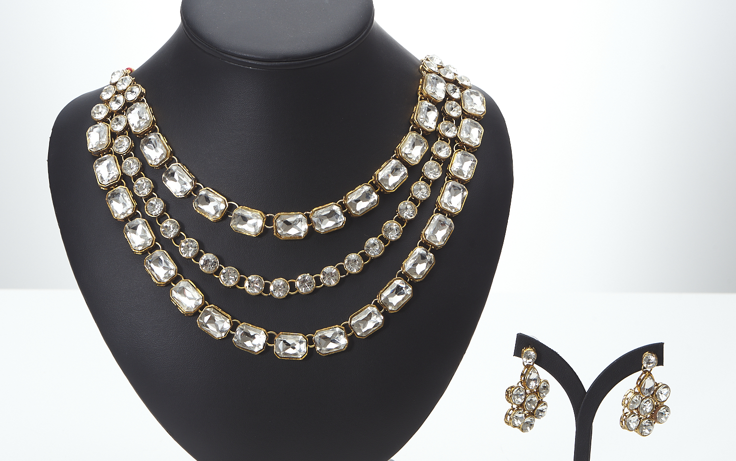 A RHINESTONE COSTUME JEWELLERY SUITE COMPRISING A TRIPLE STRAND NECKLACE AND A PAIR OF EARRINGS