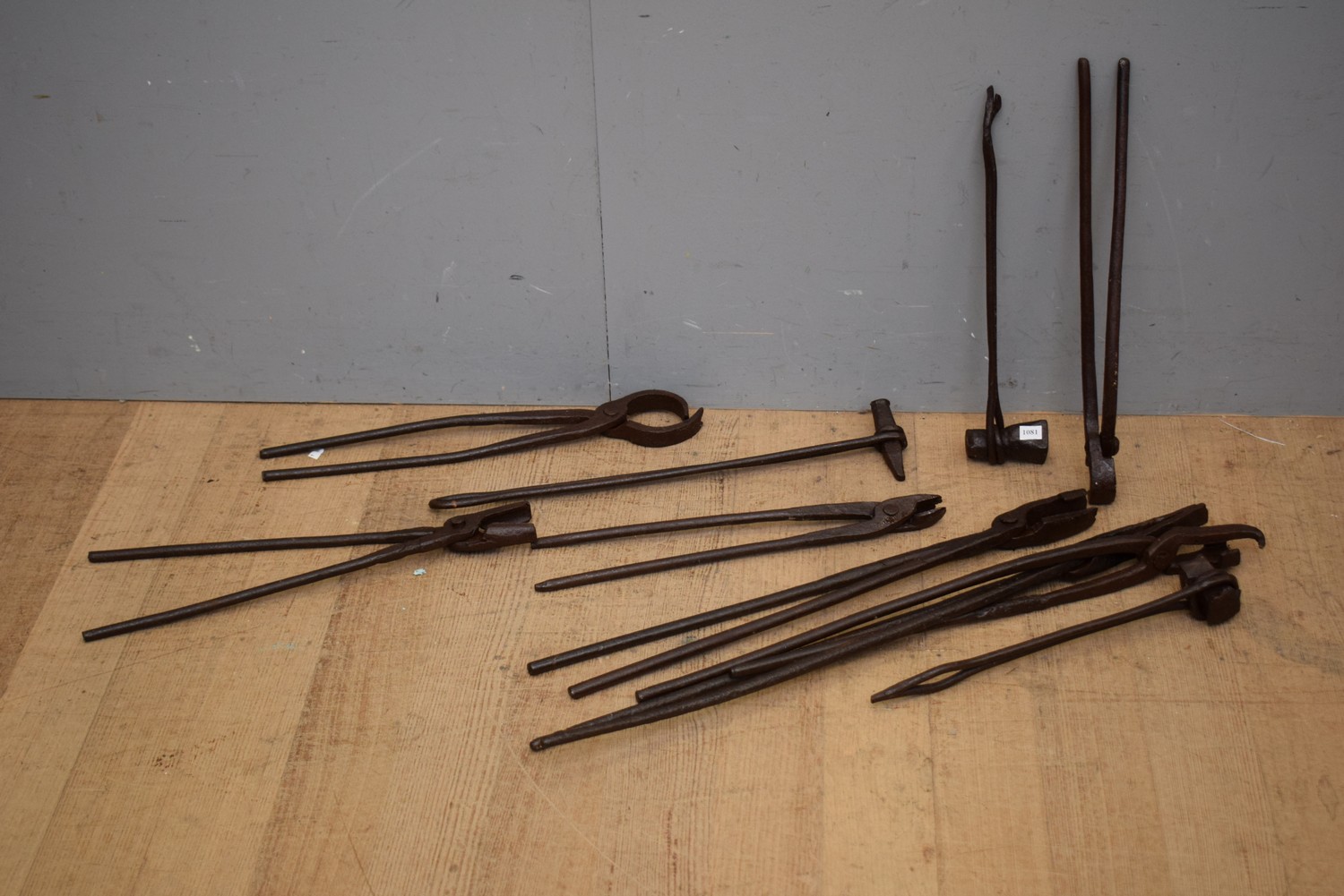 A COLLECTION OF TEN ANTIQUE BLACKSMITH'S TOOLS (L81 CM) (LEONARD JOEL DELIVERY SIZE: MEDIUM)