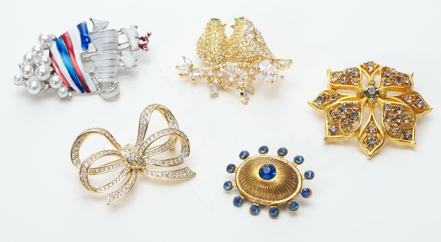 A COLLECTION OF FIVE VINTAGE BROOCHES, INCLUDING ONE BY LISNER