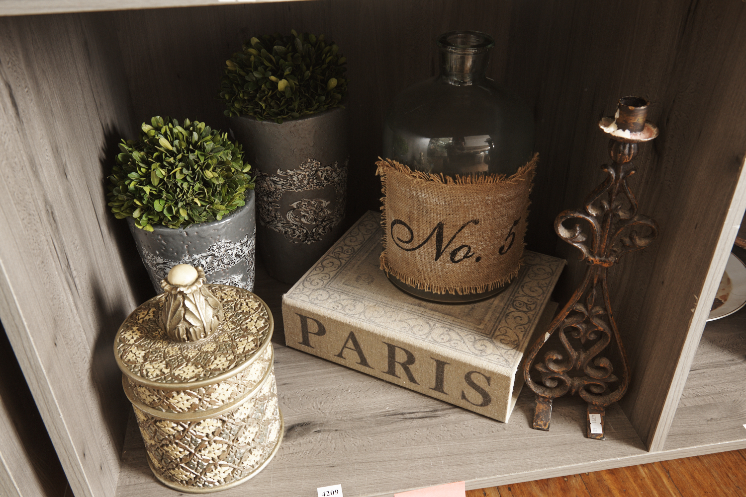 A GROUP LOT OF ITEMS IN THE FRENCH PROVINCIAL STYLE INCLUDING WROUGHT IRON CANDLE STICK, CERAMIC POTS WITH FAUX TOPIARIES, LIDDED VESSEL, VINTAGE BOTTLE AND A BOOK FORM STORAGE BOX, LEONARD JOEL LOCAL DELIVERY SIZE: SMALL