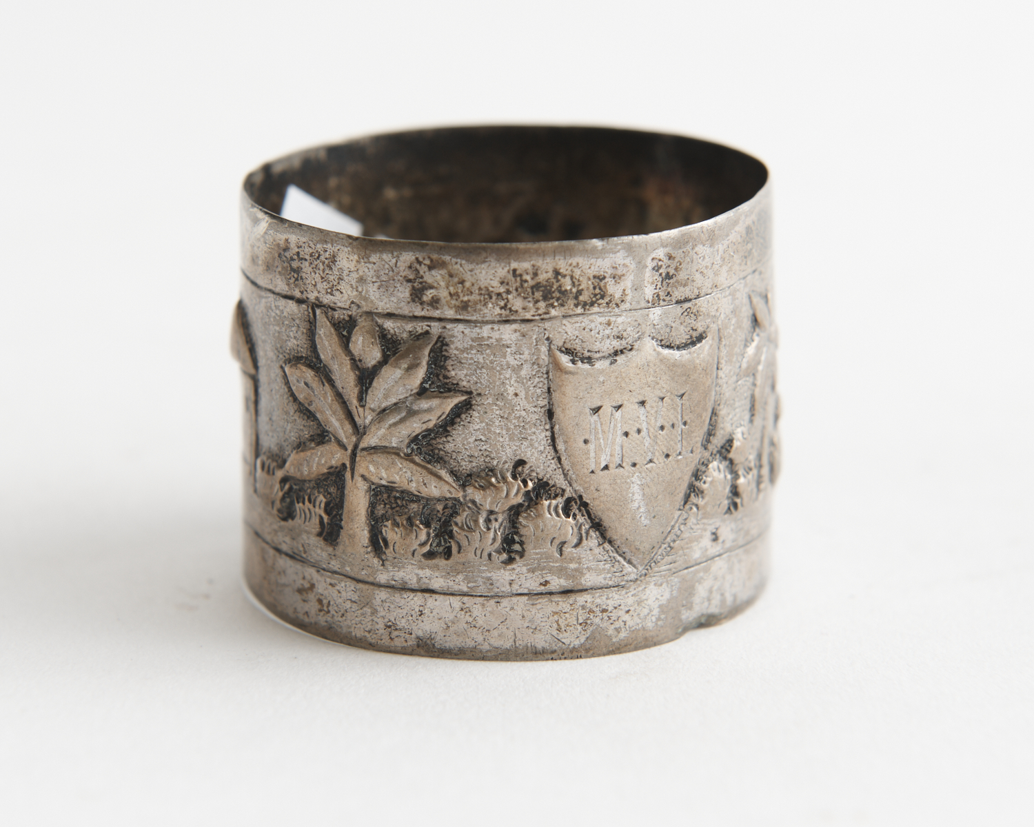 A SILVER NAPKIN RING WITH EMBOSSED AFRICAN SCENE AND ENGRAVED CREST, NO HALLMARKS, LEONARD JOEL LOCAL DELIVERY SIZE: SMALL