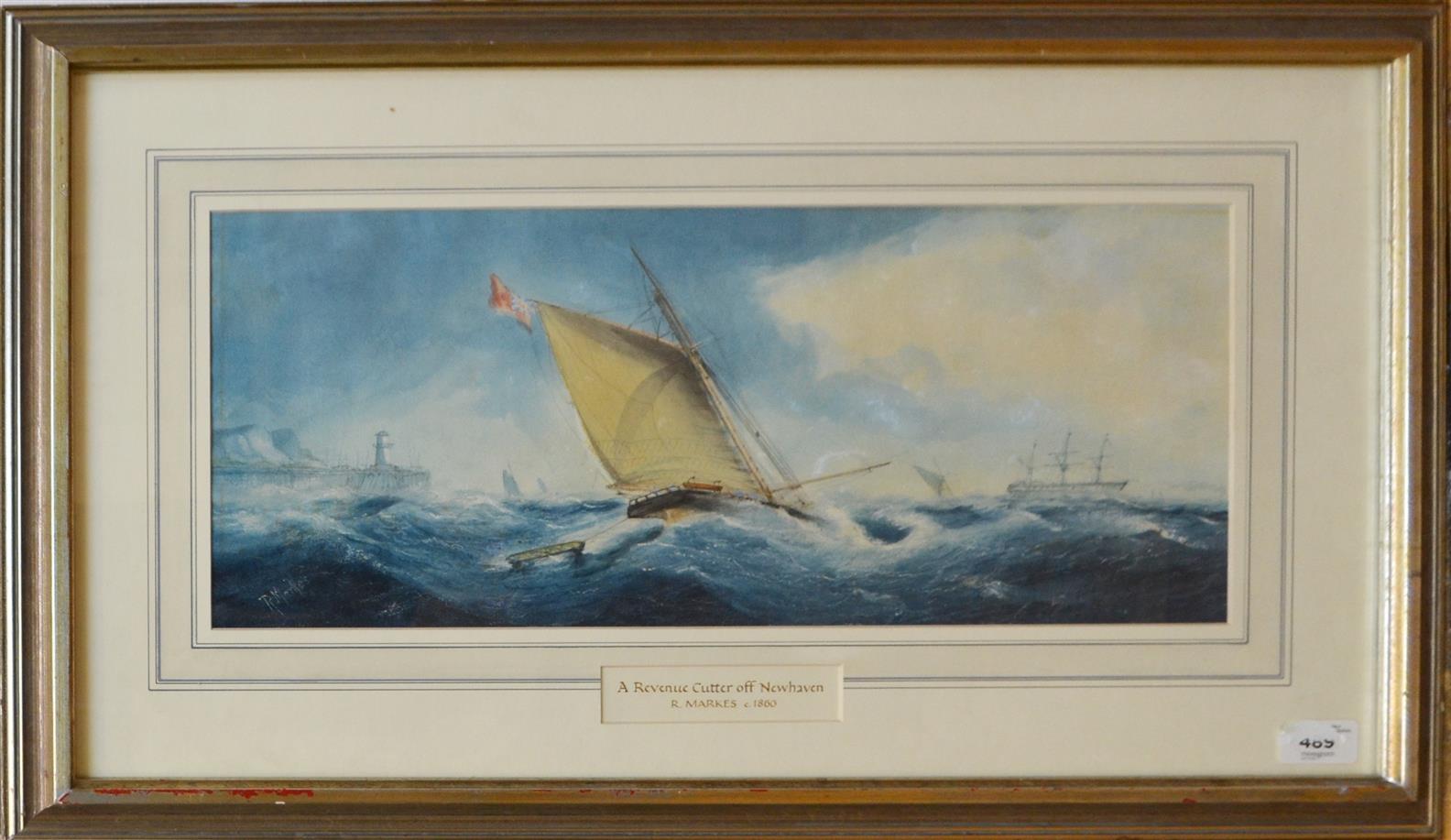 RICHMOND MARKES, A REVENUE CUTTER OFF NEWHAVEN C.1860, WATERCOLOUR ON PAPER, 20 X 48CM, CONDITION: FAIR CONDITION, SOME MOUNT BURN SEEN AROUND THE EDGES, SOME AREAS OF REPAIR MIDDLE RIGHT, OVERALL SIZE: 41 X 69CM, LEONARD JOEL DELIVERY SIZE: MEDIUM