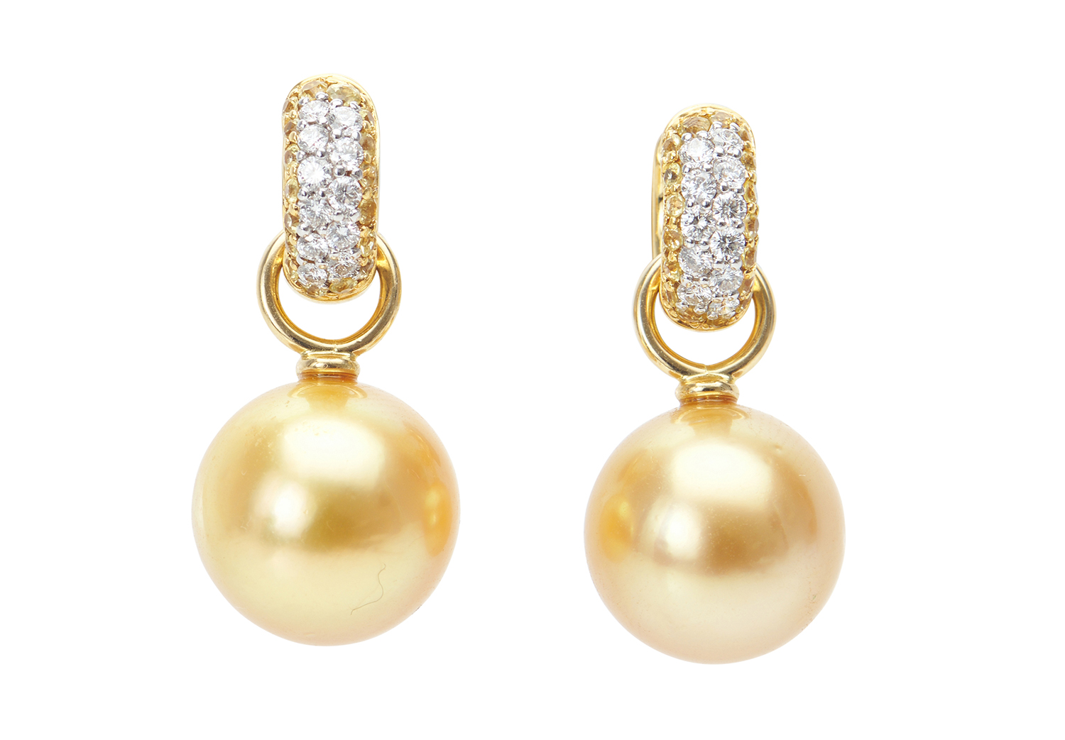 A PAIR OF SOUTH SEA PEARL, SAPPHIRE AND DIAMOND EARRINGS, EACH EARRING COMPRISING A ROUND PEARL OF DARK GOLDEN HUES MEASURING 13.0MM, SUSPENDED BELOW A DETACHABLE HUGGIE FITTING WITH A DOUBLE ROW OF ROUND BRILLIANT CUT DIAMONDS TOTALLING 0.30CT, WITHIN A BORDER OF ROUND YELLOW SAPPHIRES, IN 18CT GOLD