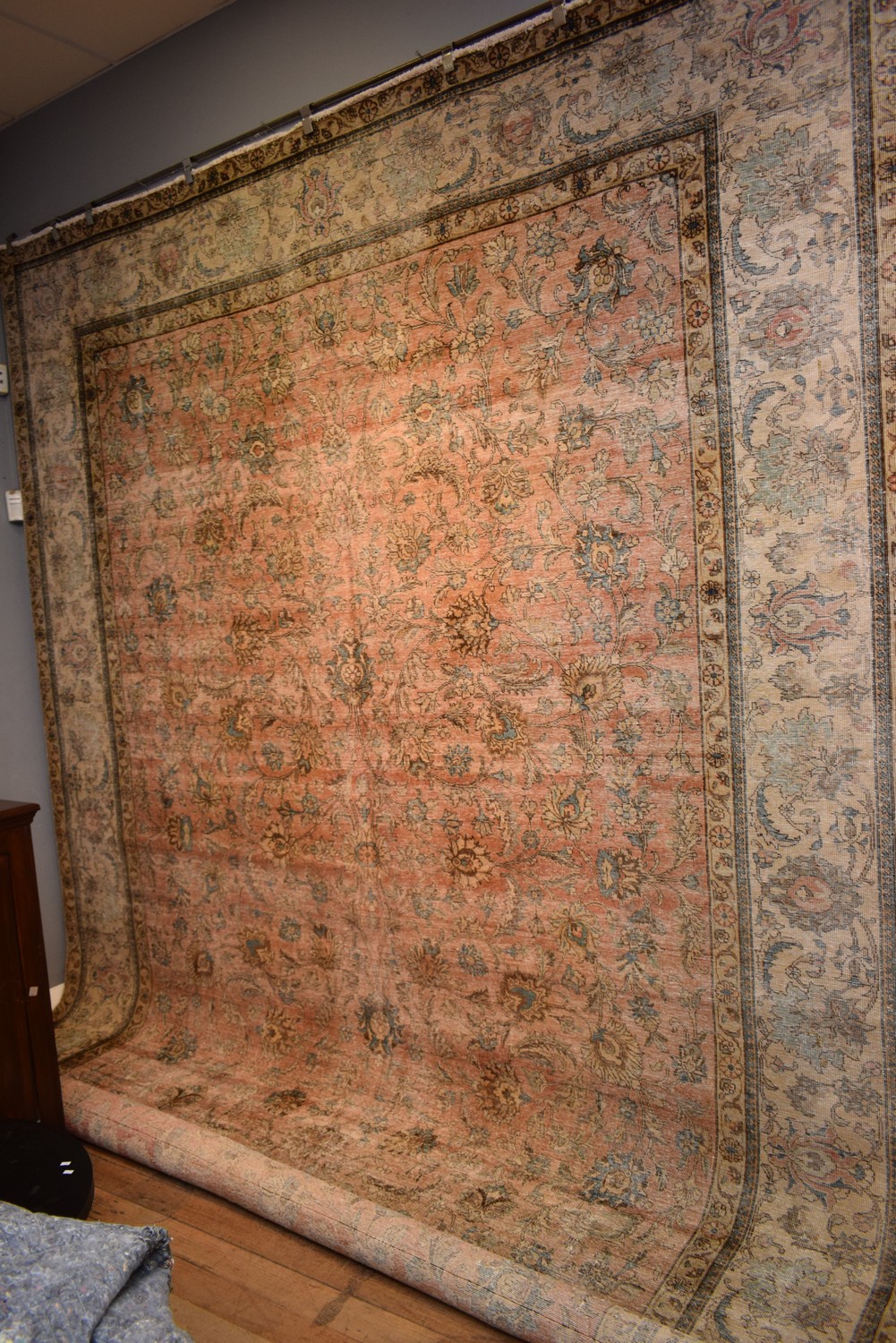 AN OVER-SIZED CONTEMPORARY VINTAGE OVER-DYED PERSIAN TABRIZ CARPET, VINTAGE PILE. A UNIQUE & INDIVIDUAL MODERN CARPET CREATED FROM AN AUTHENTIC HAND-KNOTTED ALL-OVER PALMETTE DESIGN VINTAGE PERSIAN TABRIZ CARPET. THE PILE IS SHORN AND THE ENTIRE IS OVER-DYED IN ROSE, CREAM & BLUE DYES. GALLERY EXHIBITED. CERTIFICATE OF AUTHENTICITY INCLUDED. SIZE: 460X340CM ORIGIN: PERSIA - RRP: $7,900 (LEONARD JOEL DELIVERY SIZE: X-LARGE)