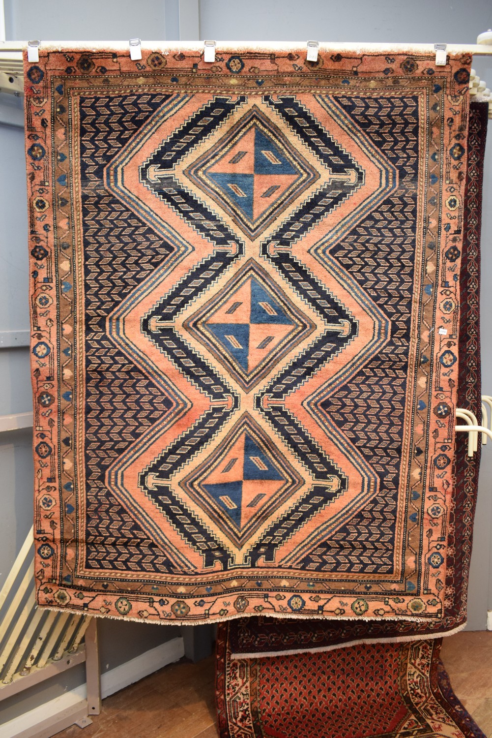 A PERSIAN SARAB RUG. 100% WOOL. SOLID & DENSE PILE. HAND-KNOTTED VILLAGE WEAVE WITH CAUCASIAN-INFLUENCED DESIGN OF TRIPLE BOLD DIAMOND-SHAPED MEDALLION SET WITHIN A FIELD OF GEOMETRIC PATTERNS. BORDER OF FLORAL PATTERNS. GALLERY INVENTORY. IN SUPERB CONDITION. CERTIFICATE OF AUTHENTICITY INCLUDED. SIZE: 189X144CM ORIGIN: PERSIA - RRP: $1,900
