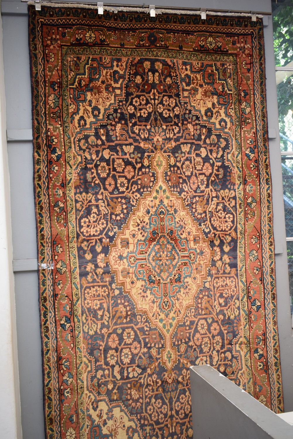 A PERSIAN JOZAN RUG, 100% FINE WOOL PILE. HAND-KNOTTED JOZAN WEAVE & WITH CLASSIC FLORAL DESIGN OF ELONGATED CHANDELIER MEDALLION AND QUARTERED CORNER MEDALLIONS IN A BLUE FIELD OF BLOSSOMING FLORAL SPRAYS. BORDER OF ROSETTES & FLORAL PATTERNS. EX-GALLERY EXHIBITED. IN PRISTINE CONDITION. CERTIFICATE OF AUTHENTICITY INCLUDED. SIZE: 330X162CM ORIGIN: PERSIA - RRP: $3,900