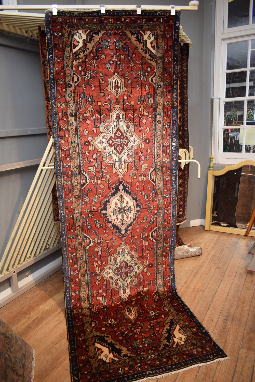 A PERSIAN MEHRABAN HALL RUNNER, 100% WOOL. DENSE PILE. STURDY & HARD-WEARING. FINELY HAND-KNOTTED VILLAGE WEAVE WITH TRADITIONAL DESIGN OF TRIPLE ELONGATED FLORAL MEDALLION & CORNER MEDALLIONS IN A RED FIELD OF FLORAL SPRAYS & TENDRILS. FLORAL-PATTERNED BORDER. EX-GALLERY INVENTORY. IN EXCELLENT CONDITION. CERTIFICATE OF AUTHENTICITY INCLUDED. SIZE: 335X109CM ORIGIN: PERSIA - RRP: $2,700