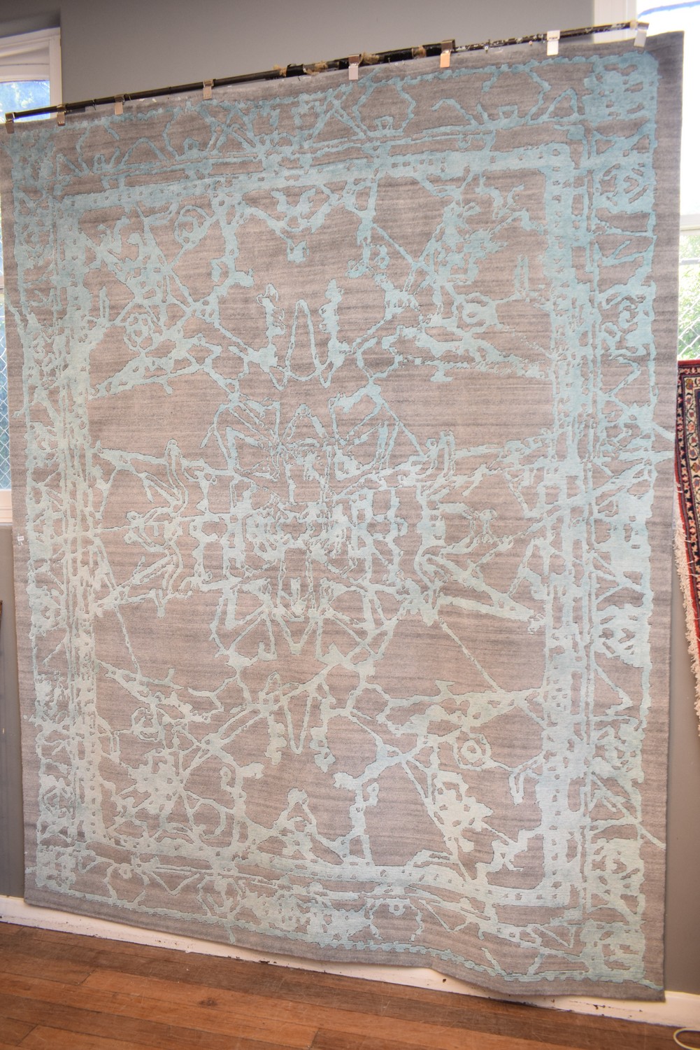 A "REZVANI DESIGN" MODERN NEPALI CARPET, WOOL & SILK TEXTURE. DENSE PILE. MODERN DESIGN OF ERASED MEDALLION AND BORDER PATTERNS IN A LIGHT BLUE TONE SET WITHIN A GREY-TONED FIELD. SOLID AND HARD-WEARING. EX-GALLERY INVENTORY. IN EXCELLENT CONDITION. CERTIFICATE OF AUTHENTICITY INCLUDED. SIZE: 307X245CM ORIGIN: INDIA - RRP: $4,800