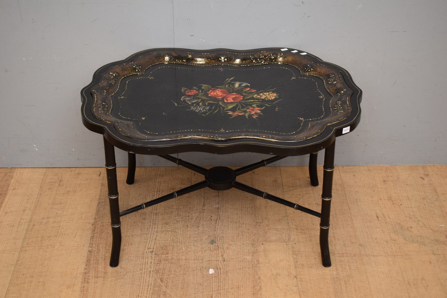 A VICTORIAN STYLE TRAY TABLE WITH HAND PAINTED DETAILING (H48 X W85 X D68 CM) (LEONARD JOEL DELIVERY SIZE: MEDIUM)