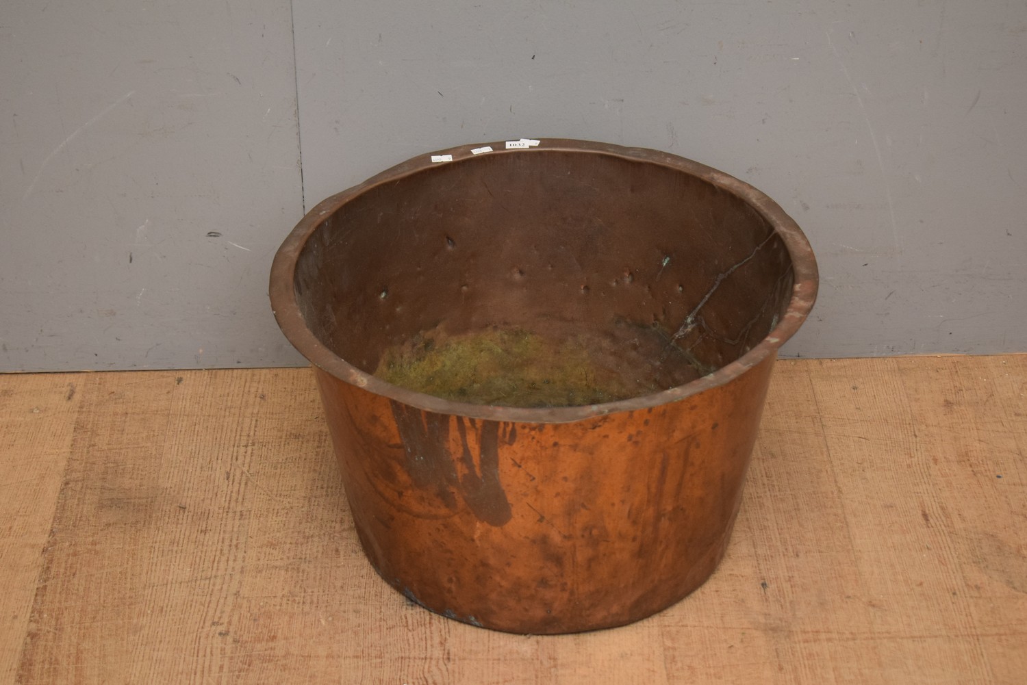 A LARGE COPPER CAULDRON (A/F) (H32 X D55 CM) (LEONARD JOEL DELIVERY SIZE: SMALL)
