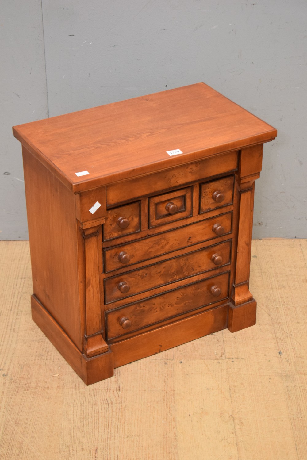 AN AUSTRALIAN PINE AND CEDAR APPRENTICE CHEST WITH CROSS BANDED EDGING AND INLAID LIGNUM VITAE DETAIL (46H x 43W x 26D CM) (LEONARD JOEL DELIVERY SIZE: SMALL)