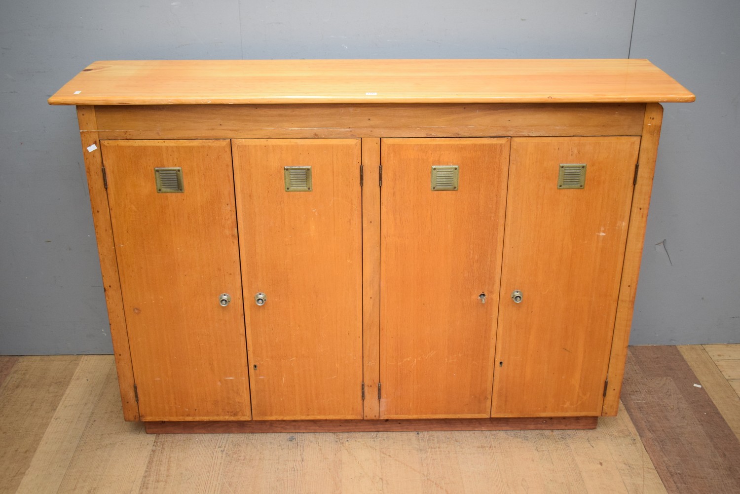 A 1930S SCIENCE LABORATORY SET OF FOUR HARDWOOD CUPBOARDS WITH DETACHED PINE TOP (A/F) (101H x 151W x 38D CM) (PLEASE NOTE THIS HEAVY ITEM MUST BE REMOVED BY CARRIERS AT THE CUSTOMER'S EXPENSE. LEONARD JOEL STAFF CANNOT ASSIST CARRYING THIS ITEM) (X-LARGE ITEM)