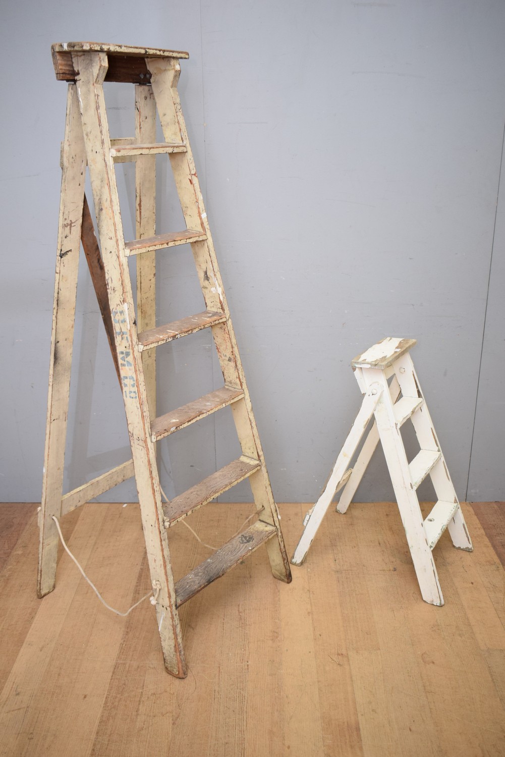 TWO 1940S HAND PAINTED WOODEN LADDERS, THE TALLER OREGON WITH HAND PAINTED STENCILED LETTERS TO SIDE (LARGEST 182H x 58W x 68D CM) CM) (LEONARD JOEL DELIVERY SIZE: LARGE)