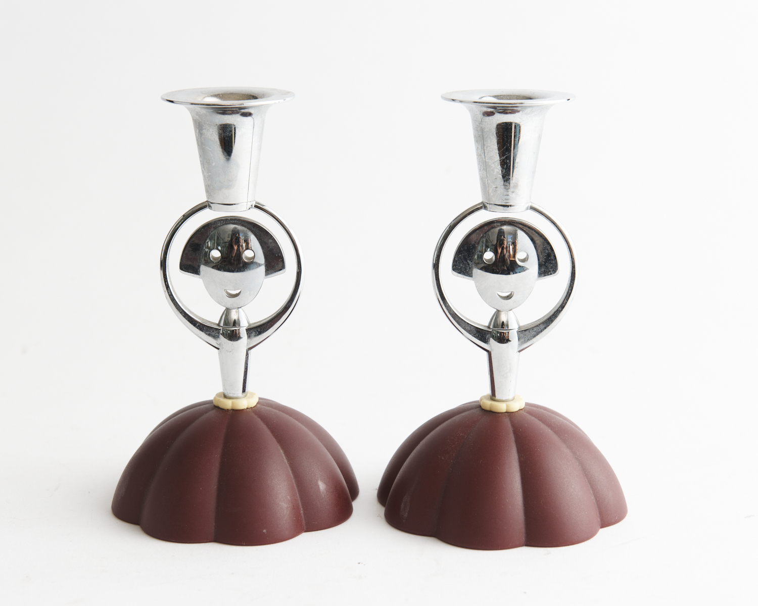 A PAIR OF ALESSI CANDLE HOLDERS, DESIGNED BY ALESSANDRO MENDINI, 1999, H.17CM, LEONARD JOEL LOCAL DELIVERY SIZE: SMALL