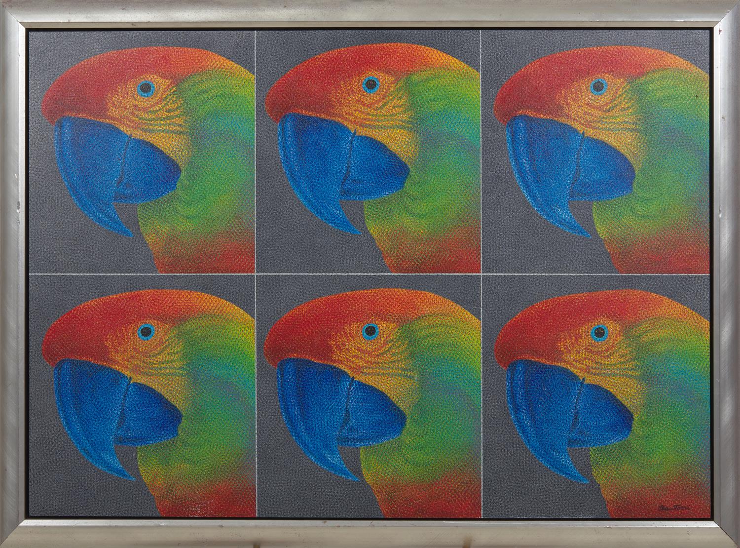 Work in very good condition with some surface blemishes present (the most prominent placed in the upper right corner and another in the lower left center). Overall size with frame: 92 x 124cm