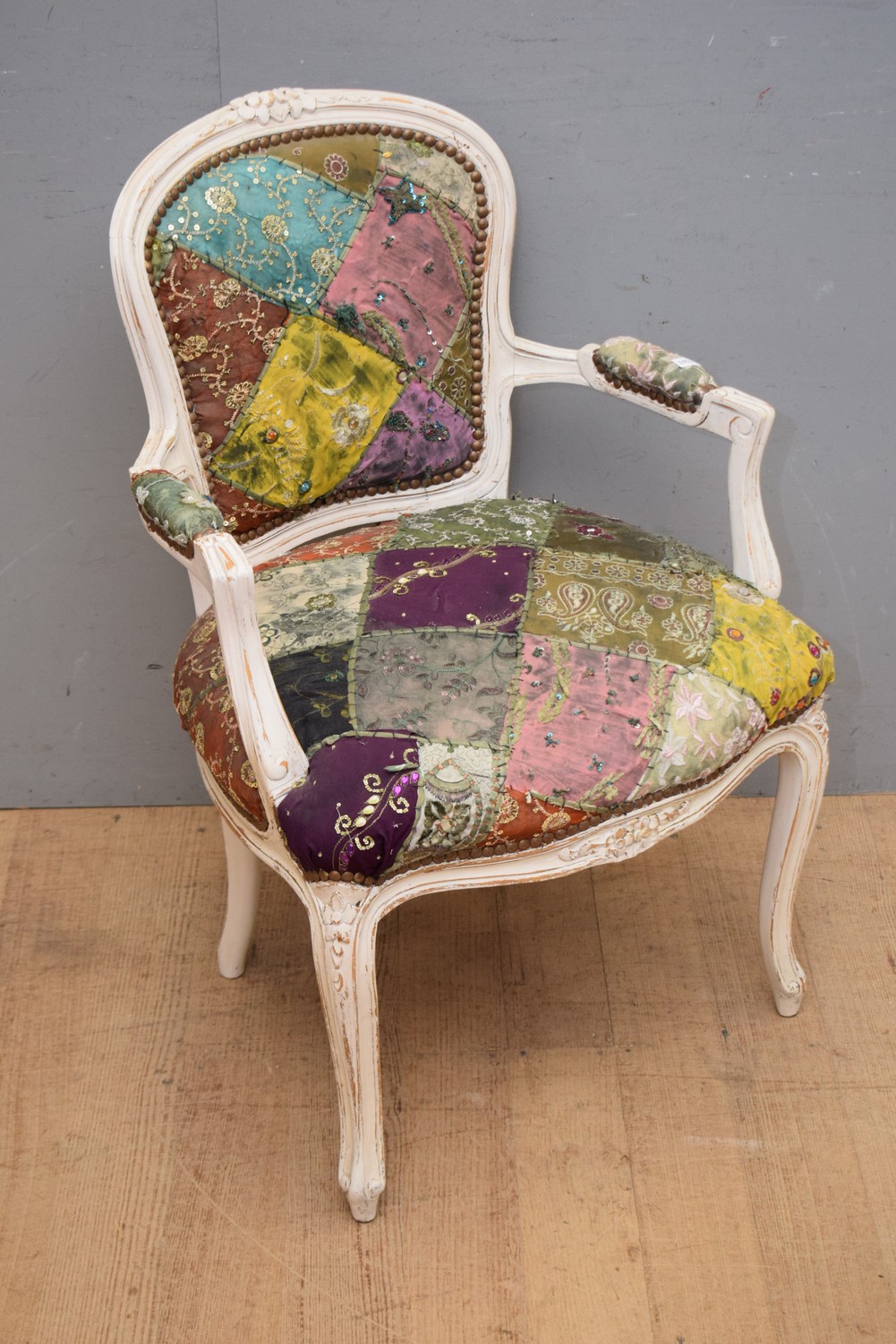 A FRENCH FAUTEUIL REUPHOLSTERED IN ANTIQUE INDIAN SARI FABRIC (H87 X W56 X D58 CM) (LEONARD JOEL DELIVERY SIZE: MEDIUM)