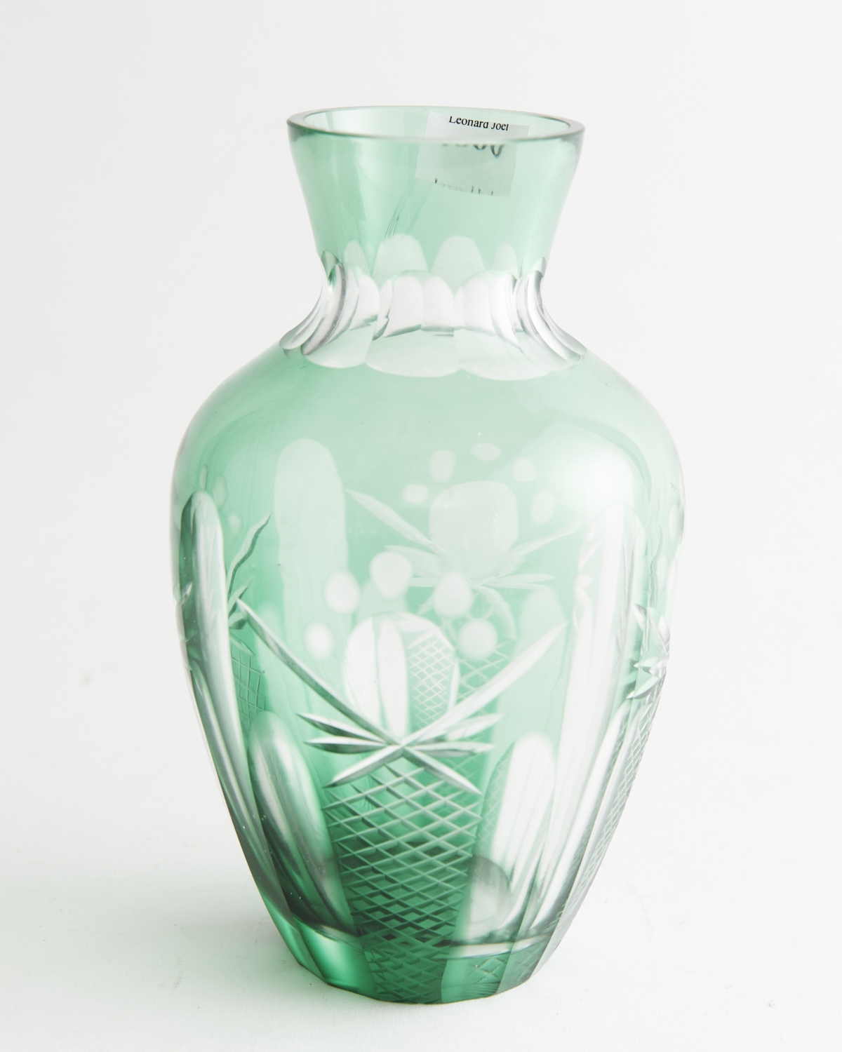 A BOHEMIAN GREEN CUT GLASS VASE, 19 CM HIGH, LEONARD JOEL LOCAL DELIVERY SIZE: SMALL