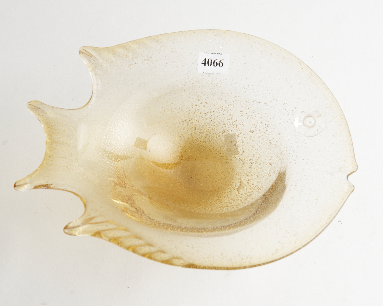 A MID CENTURY ART GLASS FISH BOWL WITH GOLD INCLUSIONS, 26 CM WIDE (IRREGULAR), LEONARD JOEL LOCAL DELIVERY SIZE: SMALL