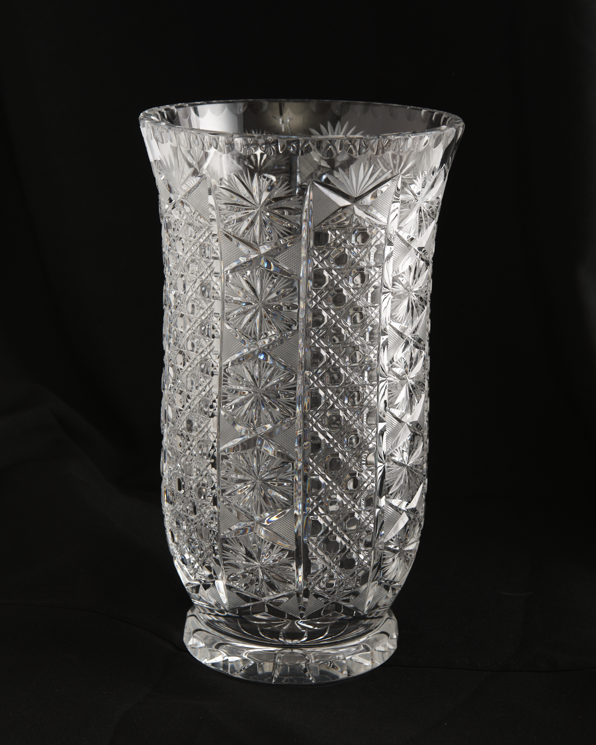 A BOHEMIAN HEAVY CUT CRYSTAL VASE, 28 CM HIGH, LEONARD JOEL LOCAL DELIVERY SIZE: SMALL