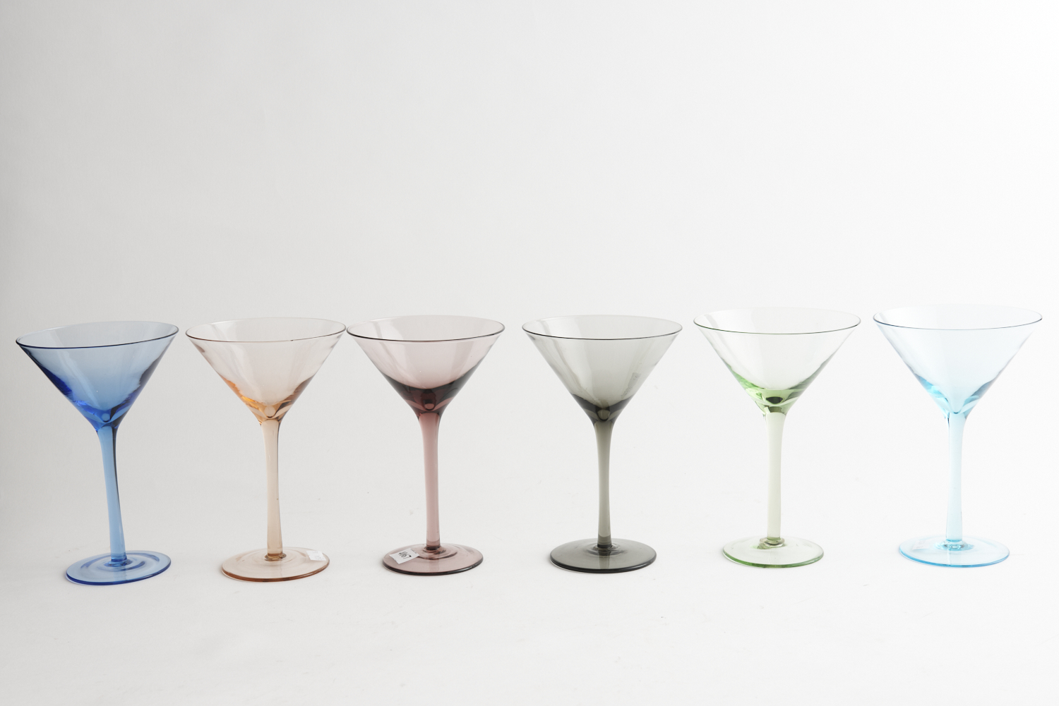 A SET OF SIX RETRO HARLEQUIN COLOURED GLASS MARTINI GLASSES, 18 CM HIGH, LEONARD JOEL LOCAL DELIVERY SIZE: SMALL