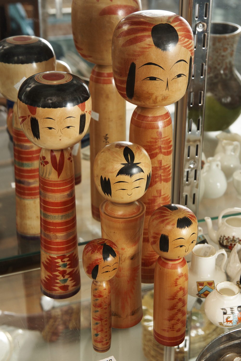FIVE VINTAGE WOODEN JAPANESE HAND PAINTED KOKESHI DOLLS, TALLEST H.39CM, LEONARD JOEL LOCAL DELIVERY SIZE: SMALL