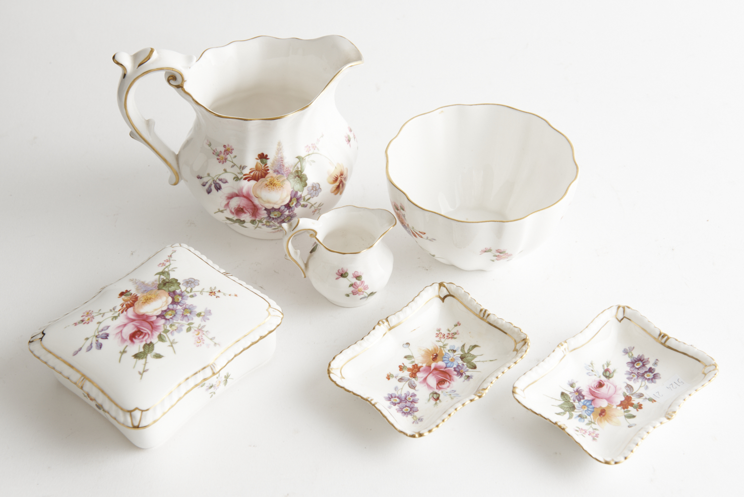 SIX PIECES OF ROYAL CROWN DERBY 'DERBY POSIES' INCLUDING LARGE JUG AND BOWL LIDDED TRINKET AND OTHER, LEONARD JOEL LOCAL DELIVERY SIZE: SMALL