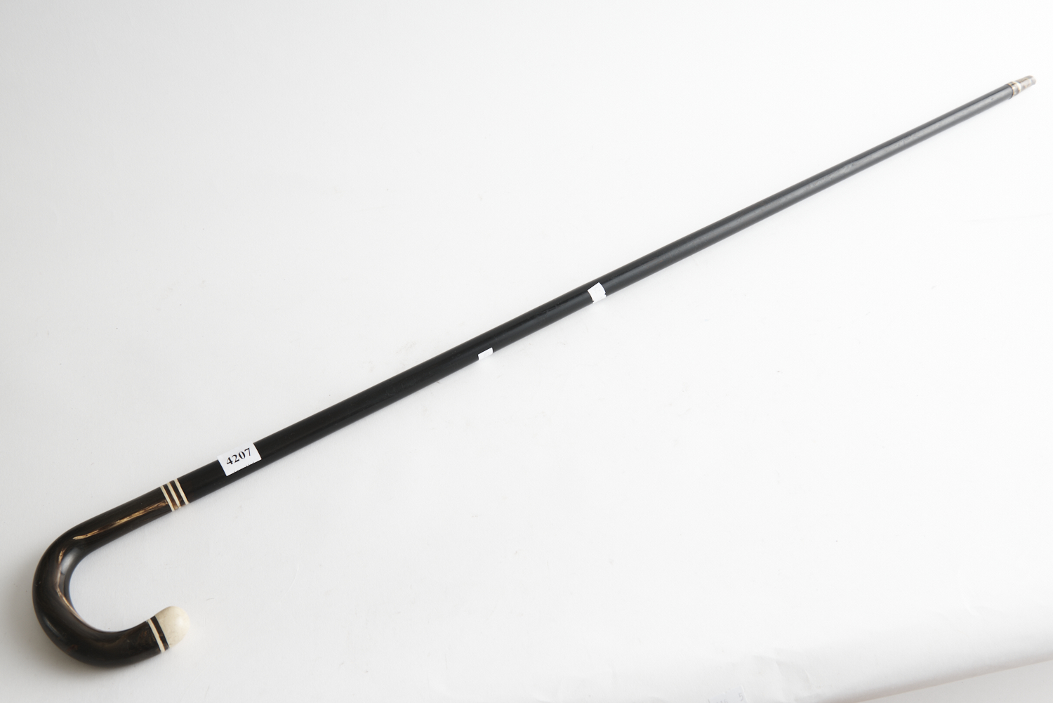 A ROSEWOOD AND BENT HORN HANDLED WALKING STICK L.93CM, LEONARD JOEL LOCAL DELIVERY SIZE: SMALL