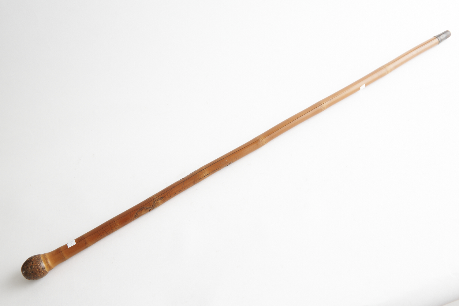 AN INTRICATELY CARVED JAPANESE WALKING STICK WITH SPIDERS IN WEBS (A/F SPLITTING TO BAMBOO) L.91CM, LEONARD JOEL LOCAL DELIVERY SIZE: SMALL