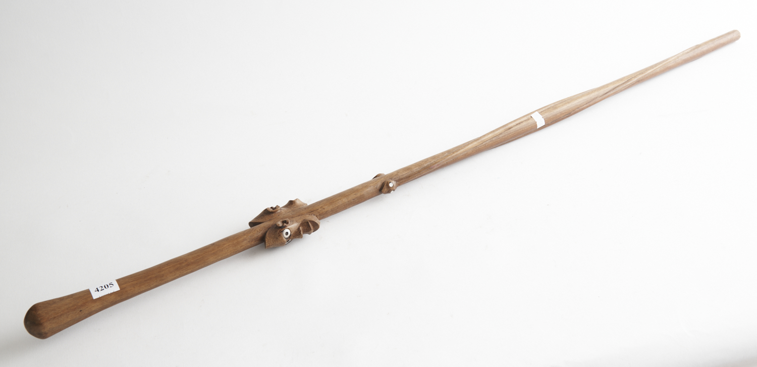 A CARVED TRIBAL FIGURAL WALKING STICK WITH MOTHER OF PEARL EYES L.101CM, LEONARD JOEL LOCAL DELIVERY SIZE: SMALL