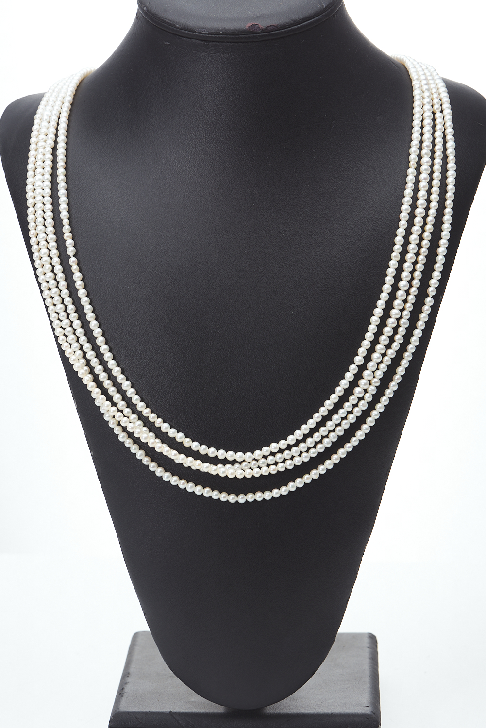 A MATINEE LENGTH OF HIGH QUALITY FRESHWATER PEARL NECKLACE, COMPRISING FOUR STRANDS, PEARLS MEASURING 3.8MM, TO A 9CT WHITE GOLD BALL CLASP, LENGTH 690MM