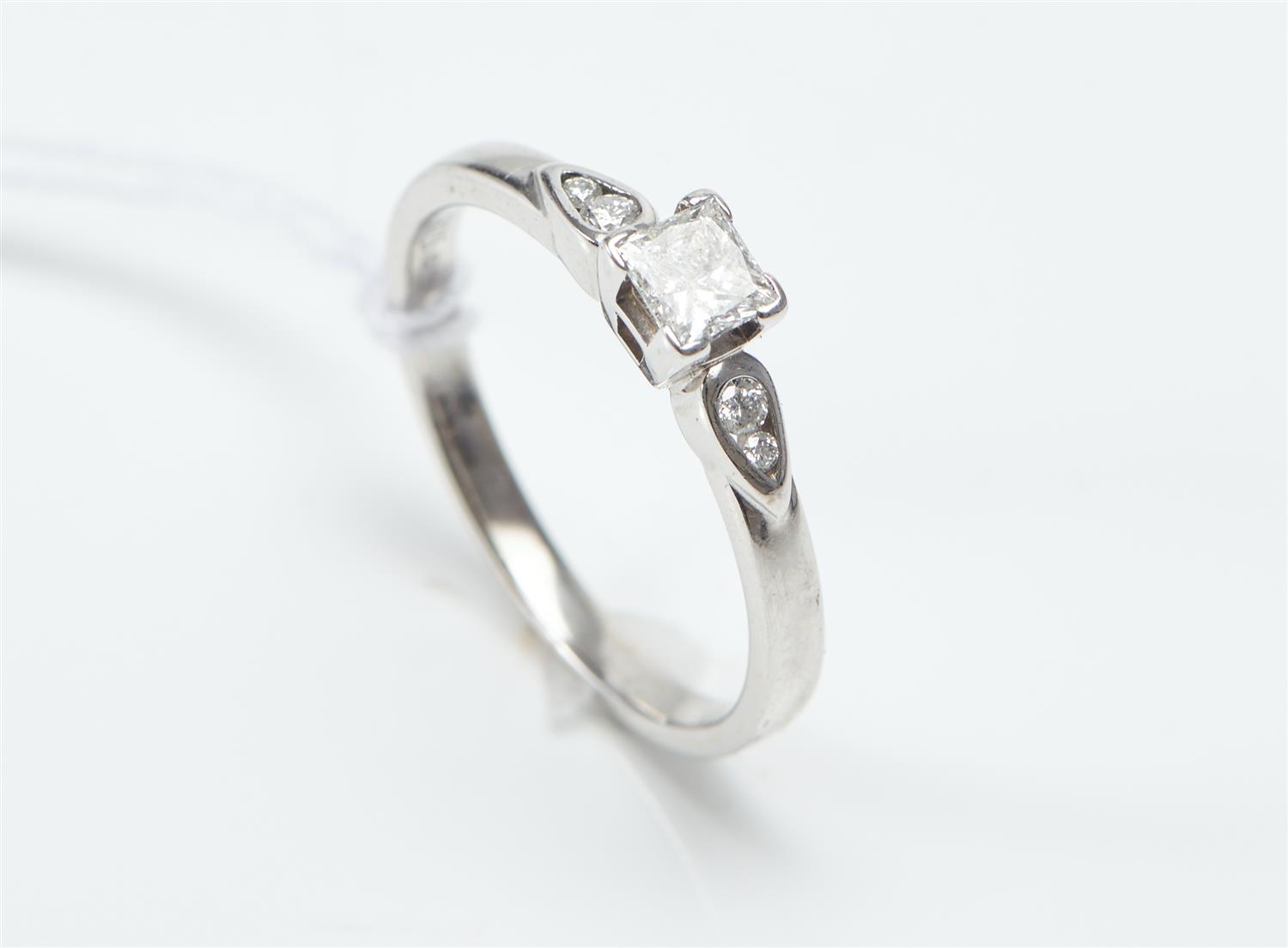 The central diamond weighs approximately 0.30ct with the sides stones totalling approximately 0.05ct. The diamonds' grades are H-I/P1. Stones are secure in their settings and the band shows minor signs of wear.