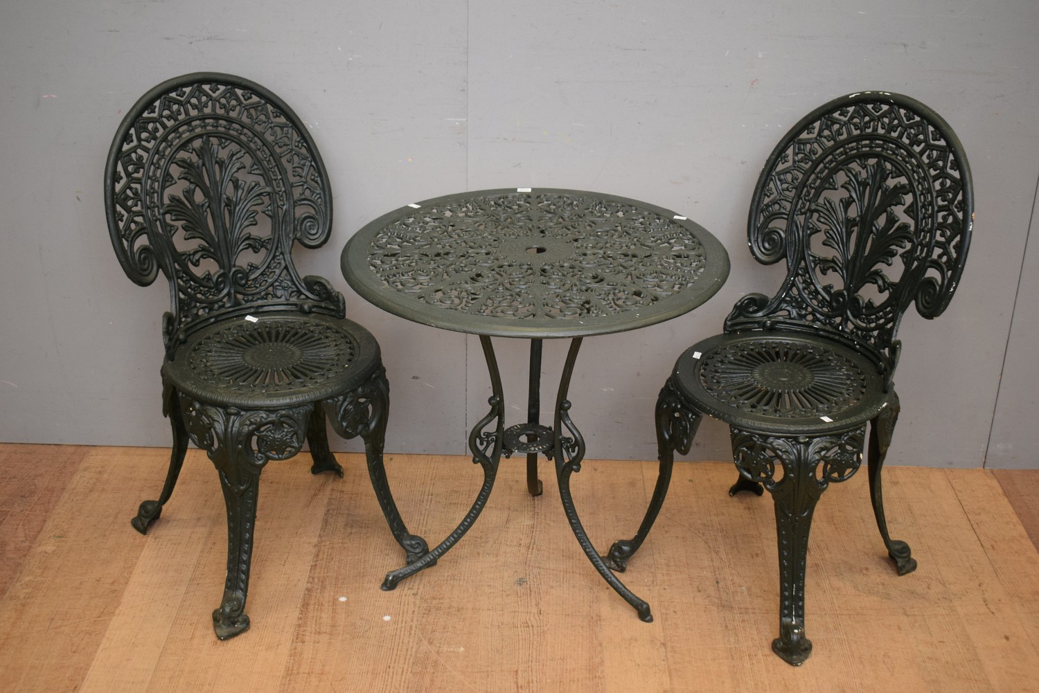 A VICTORIAN STYLE CAST IRON THREE PIECE SETTING (TABLE 45H x 65D CM) (LEONARD JOEL DELIVERY SIZE: LARGE)