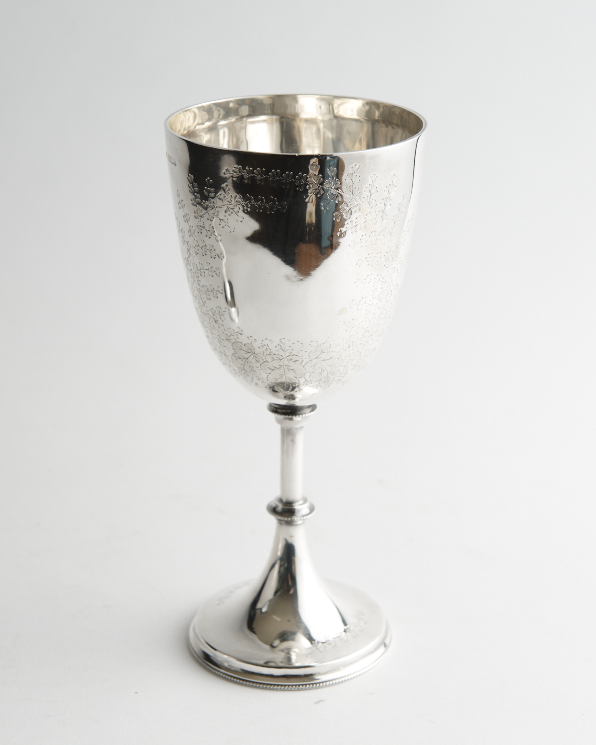 A STERLING SILVER CHALICE, ENGRAVED, HALLMARKED MAPPIN AND WEBB LONDON, 24.5 CM HIGH, LEONARD JOEL LOCAL DELIVERY SIZE: SMALL