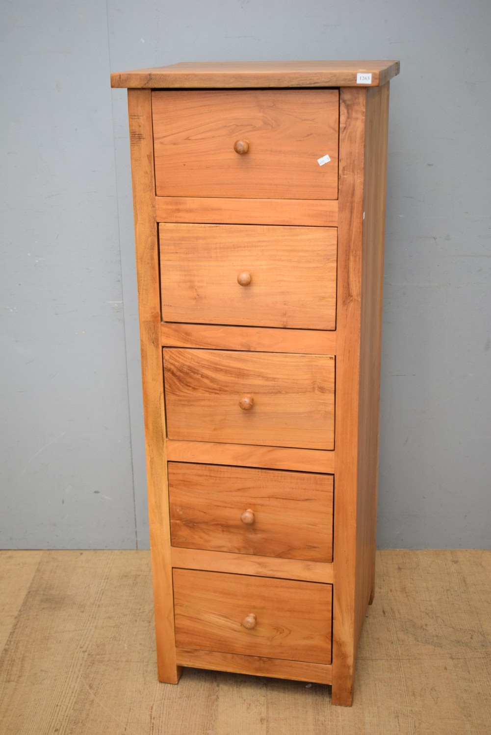 A FIVE DRAWER TEAK TALLBOY (A/F) ( 136H X 50W X 50D CM) (LEONARD JOEL DELIVERY SIZE: LARGE)