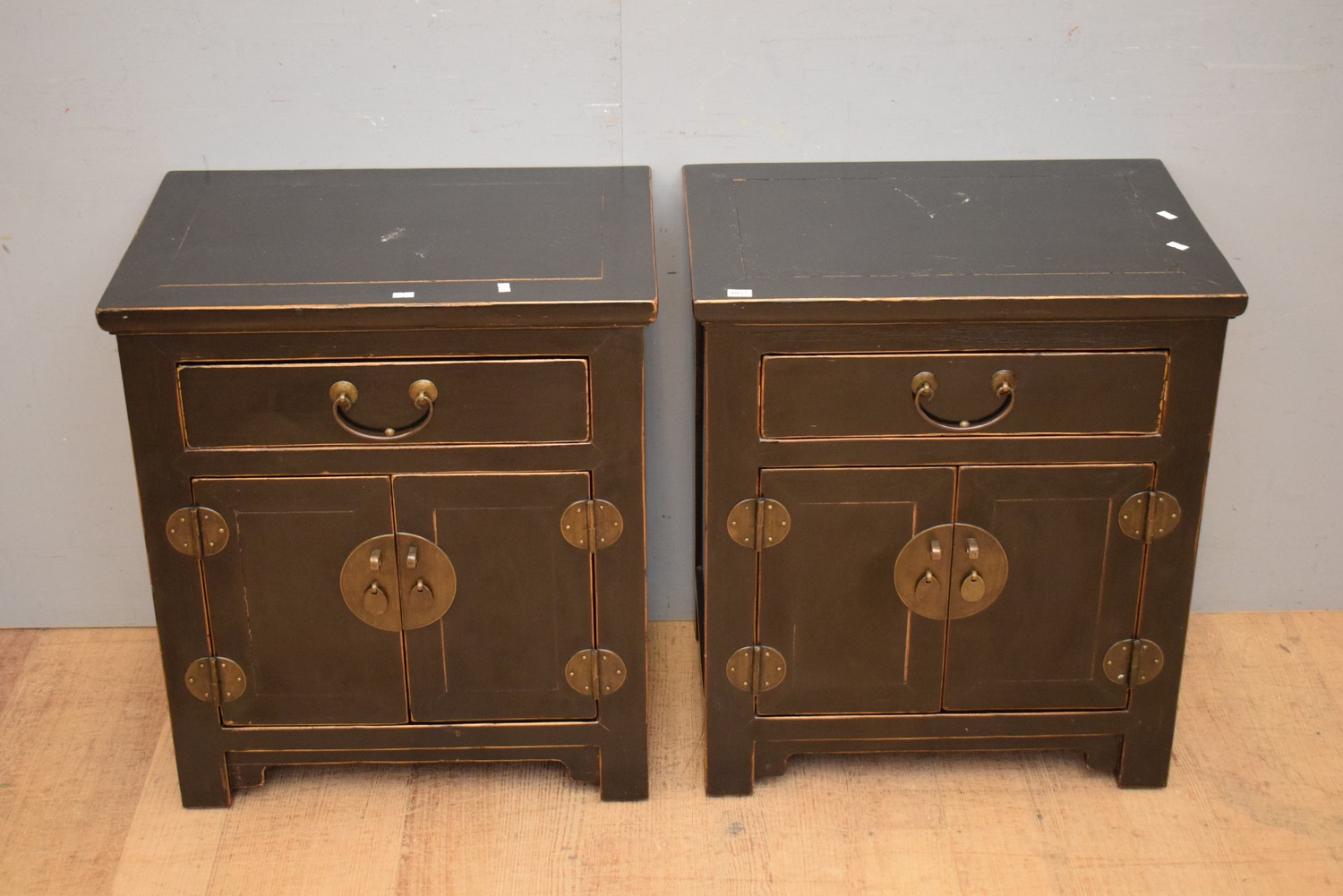 A PAIR OF EBONISED CHINESE CABINETS (H66 X W59 X 41 CM) (LEONARD JOEL DELIVERY SIZE: MEDIUM)