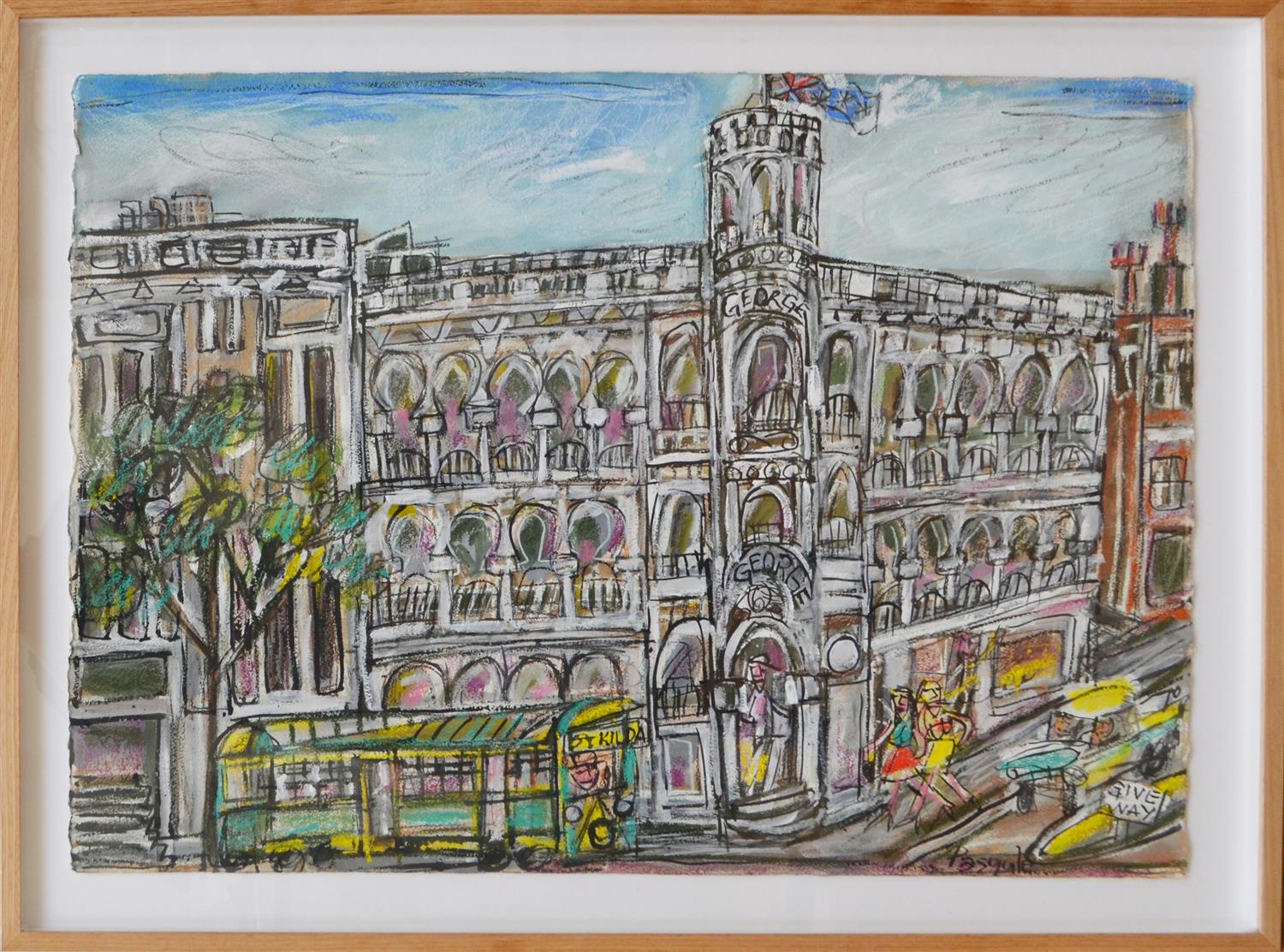 PASQUALE GIARDINO, GEORGE HOTEL, ST KILDA, MIXED MEDIA ON PAPER, 75 X 106CM, FRAME SIZE: 90 X 120CM, CONDITION: VERY GOOD CONDITION, NO FAULTS TO REPORT. LEONARD JOEL DELIVERY SIZE: LARGE