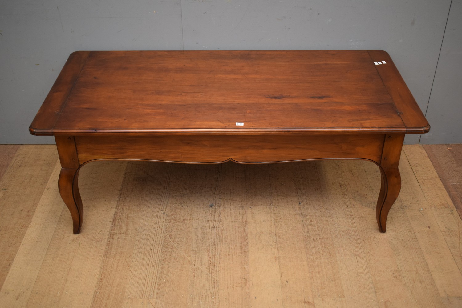 A FRENCH PROVINCIAL STYLE CHERRYWOOD COFFEE TABLE WITH TWO DRAWERS (50H x 135W x 65D CM) (LEONARD JOEL DELIVERY SIZE: LARGE)