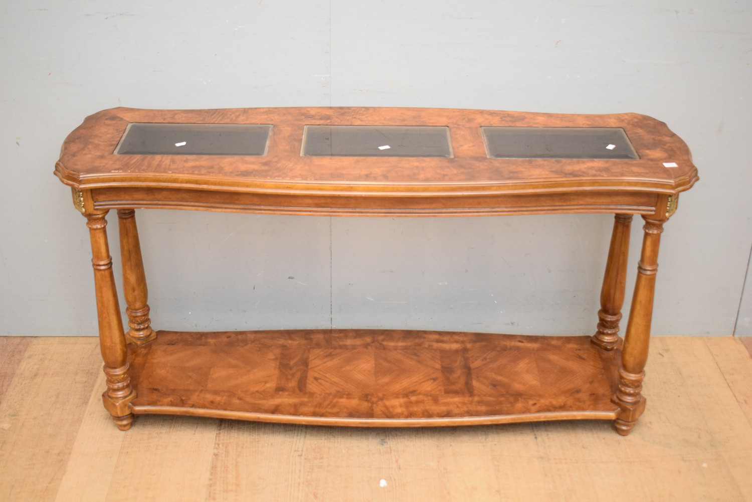 A WALNUT VENEERED TWO TIER CONSOLE WITH GLASS INSET (H70 X W136 X D41 CM) (LEONARD JOEL DELIVERY SIZE: MEDIUM)