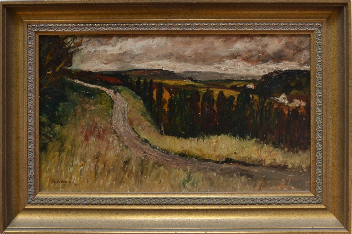 GEORGE FEATHER LAWRENCE, FARMS NEAR KIAMA 1959, OIL ON BOARD, 33 X 54CM, FRAME SIZE: 45 X 68CM, CONDITION: LIGHT CRACKING, WEAR TO SURFACE SEEN, WEAR TO FRAME, LEONARD JOEL DELIVERY SIZE: MEDIUM