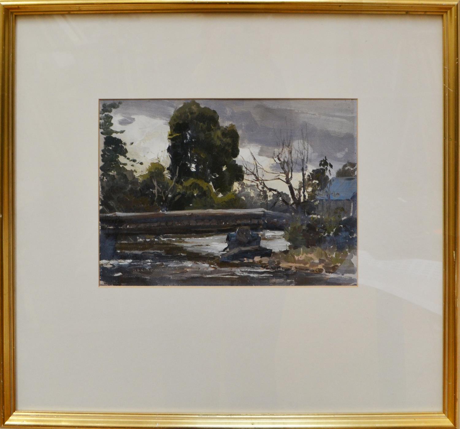 HAROLD HERBERT, THE BRIDGE, OIL ON CANVAS ON BOARD, 29 X 40CM, FRAME SIZE: 67 X 72CM, CONDITION: LIGHT AREAS OF CRACKING SEEN, PINHOLE MARKS IN THE CORNERS, SCRATCHES TO FRAME, LEONARD JOEL DELIVERY SIZE: MEDIUM