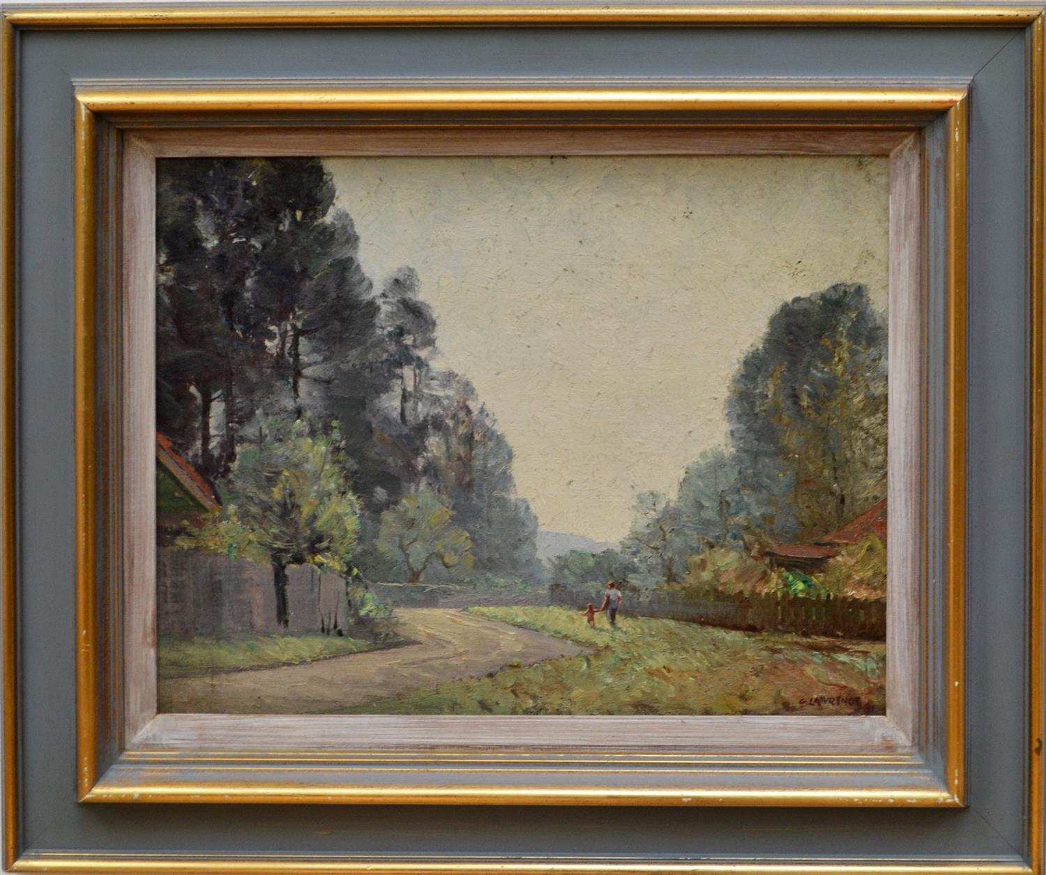 GEORGE FEATHER LAWRENCE, SUNDAY MORNING, OIL ON BOARD, 34 X 44CM, FRAME SIZE: 53 X 63CM, CONDITION: SURFACE DIRT, FLECKS OF BROWN FOREIGN MATTER STUCK TO THE SURFACE AND SOME CRACKING, LEONARD JOEL DELIVERY SIZE: MEDIUM