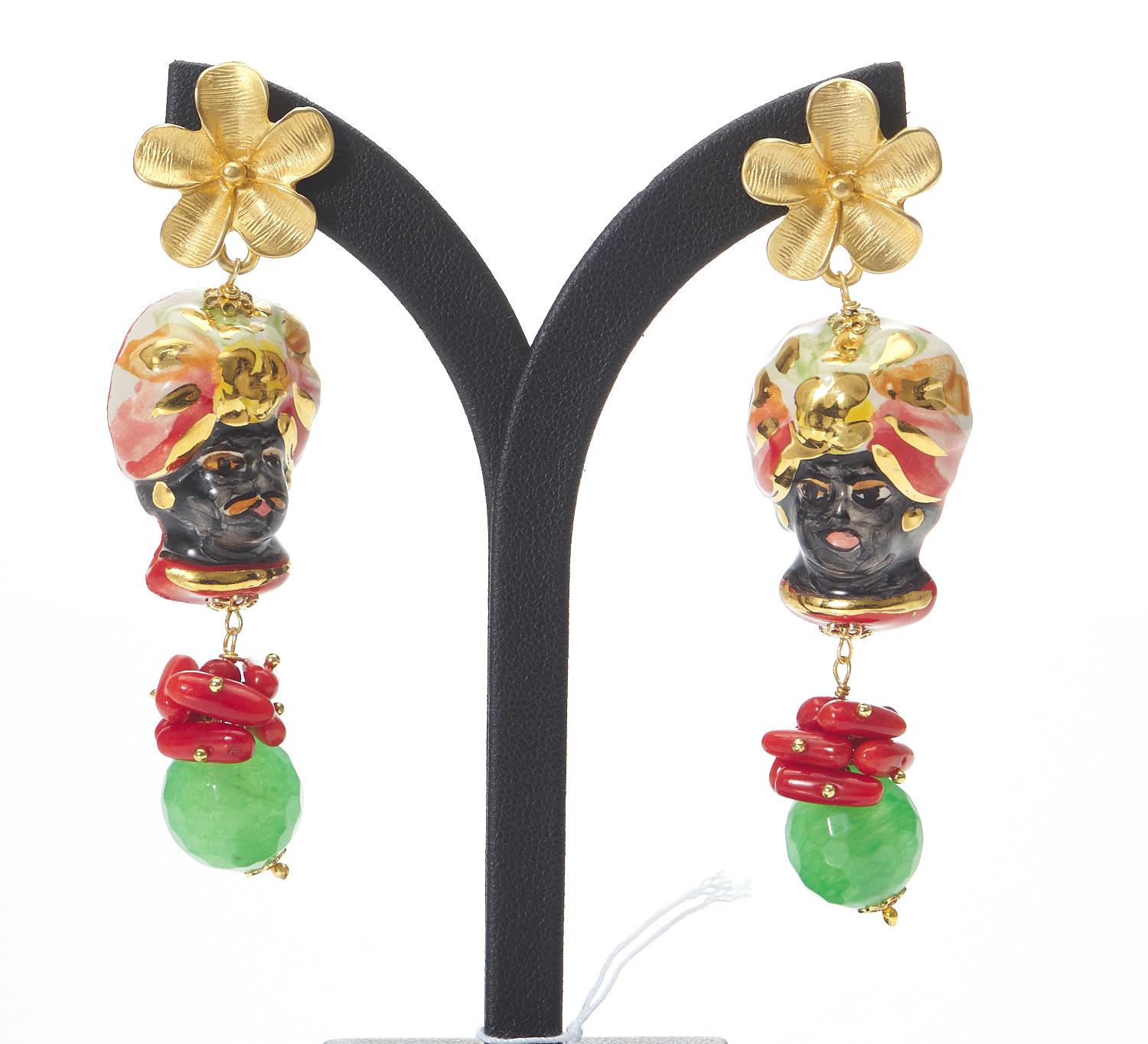 A PAIR OF SICILIAN DROP EARRINGS FEATURING A CALTAGIRONE CERAMIC DEPICTING BLACKAMOOR, WITH CORAL AND CHRYSOPRASE BEADS, TO POST AND BUTTERFLY FITTINGS IN BRASS, TOTAL LENGTH 80MM