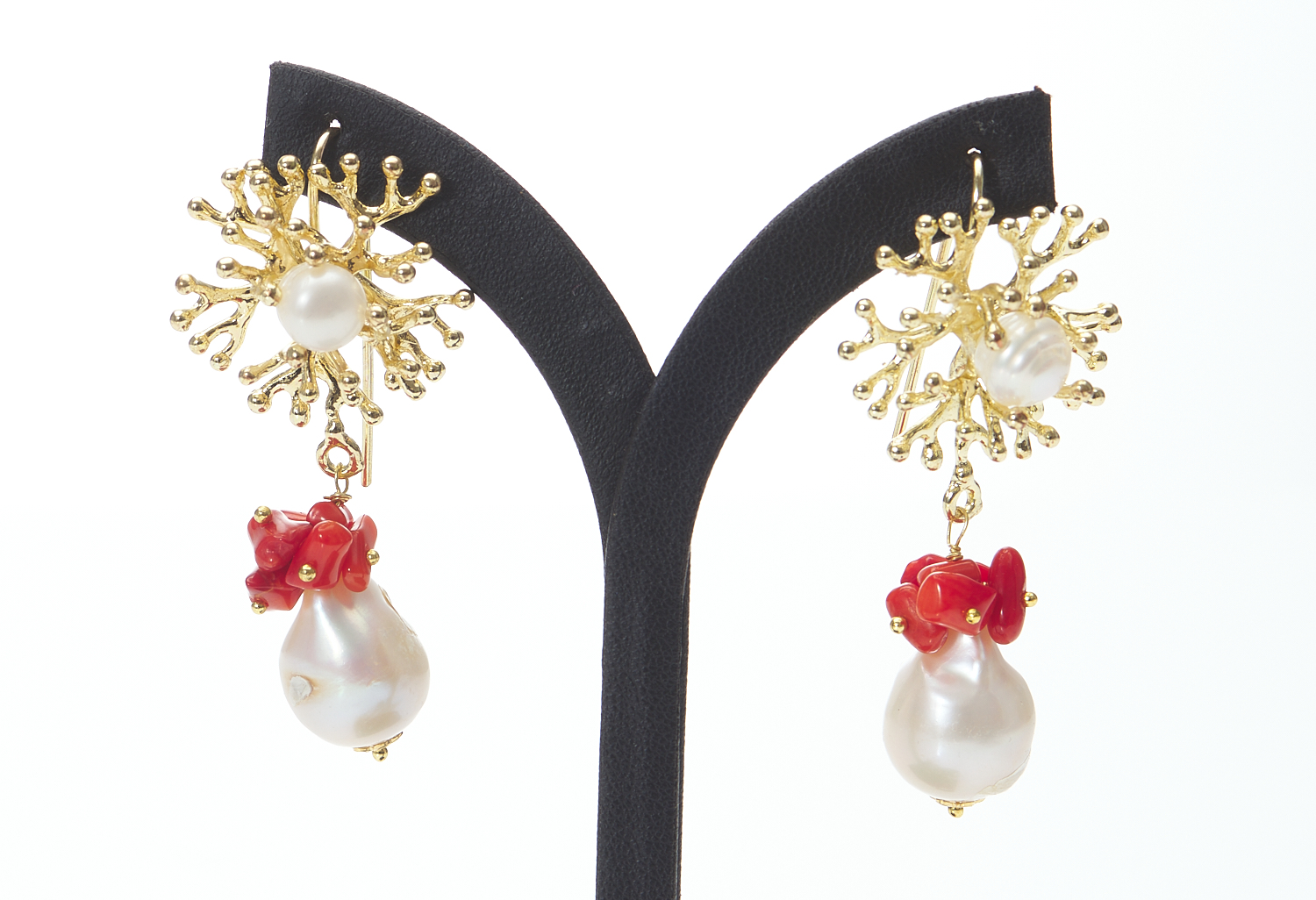 A PAIR OF SICILIAN DROP EARRINGS SET WITH FRESHWATER PEARLS AND DYED CORAL IN GILT, TOTAL LENGTH 55MM