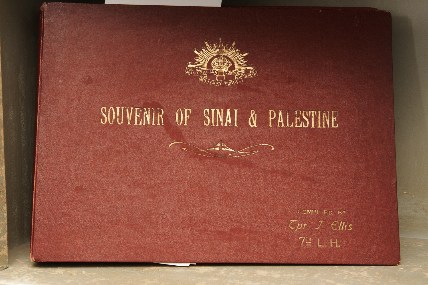TWO BOUND PHOTOGRAPH ALBUMS, 'SOUVENIR OF SINAI & PALESTINE'; AND 'SOUVENIR OF PALESTINE', INSCRIBED TITLES AND 'AUSTRALIAN COMMONWEALTH MILITARY FORCES' WITH BADGE, 'COMPILED BY / TPR J. ELLIS / 7TH L.H.', SELF PUBLISHED BY TROOPER J. (JACK) ELLIS, INSCRIBED TO THE INSIDE FRONT COVER 'SENT BY DR. GOGGINS', FEATURING PHOTOGRAPHS TAKEN BY ELLIS DOCUMENTING THE ACTIVITIES UNDERTAKEN BY THE AUSTRALIAN LIGHT HORSE IN THE SINAI AND SOUTH PALESTINE IN THE PERIOD FROM AUGUST 1916 TO OCTOBER 1919, LEONARD JOEL LOCAL DELIVERY SIZE: SMALL